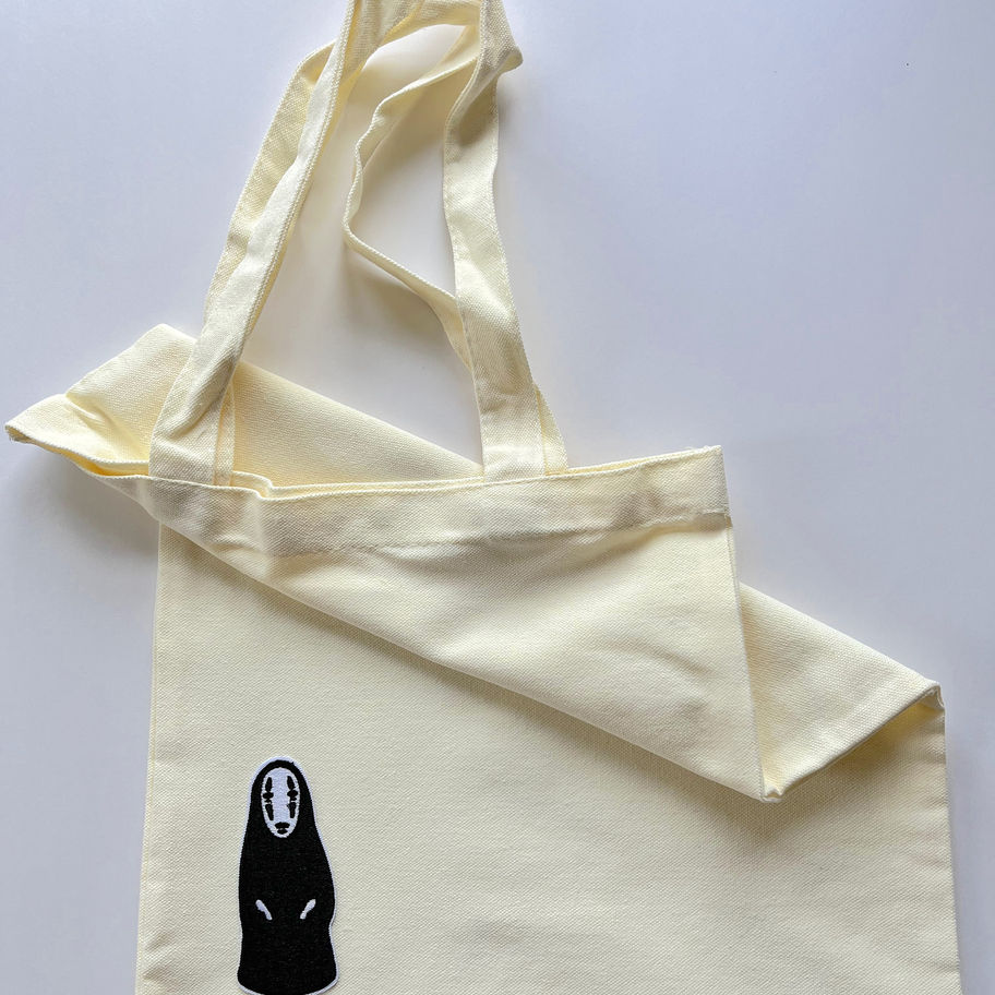 Be as unforgettable as Kaonashi (No-Face) with this beautifully designed tote bag inspired by Spirited Away. Featuring a high-quality embroidered patch of the enigmatic character, this tote is both stylish and practical, perfect for everyday use or as a statement piece for anime fans.