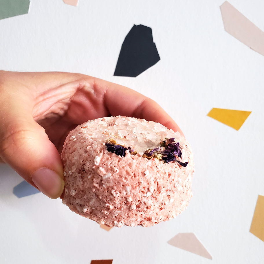 Ingrédients : bicarbonate de soude, sel d'Epsom, sel rose, sel de la mer Morte, pétales de lavande bio, argile violette, poudre de marante bio (arrowroot), huile de noix de coco & huile essentielle bio