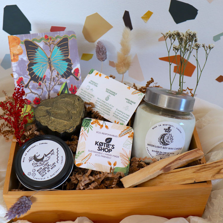 Notre coffret cadeau Clair de lune offre à son destinataire une expérience fantaisiste de parfum de rose boisée. Prenez plaisir à vous faire dorloter avec des parfums qui vous font imaginer un clair de lune ou une étoile au sommet d'une montagne. Ces coffrets spécialment conçus pour les vacances sont limités. Un total de 20 boîtes sont disponibles, alors prenez la vôtre aujourd'hui ! Inclus dans votre boîte est ci-dessous avec les options de boîte :